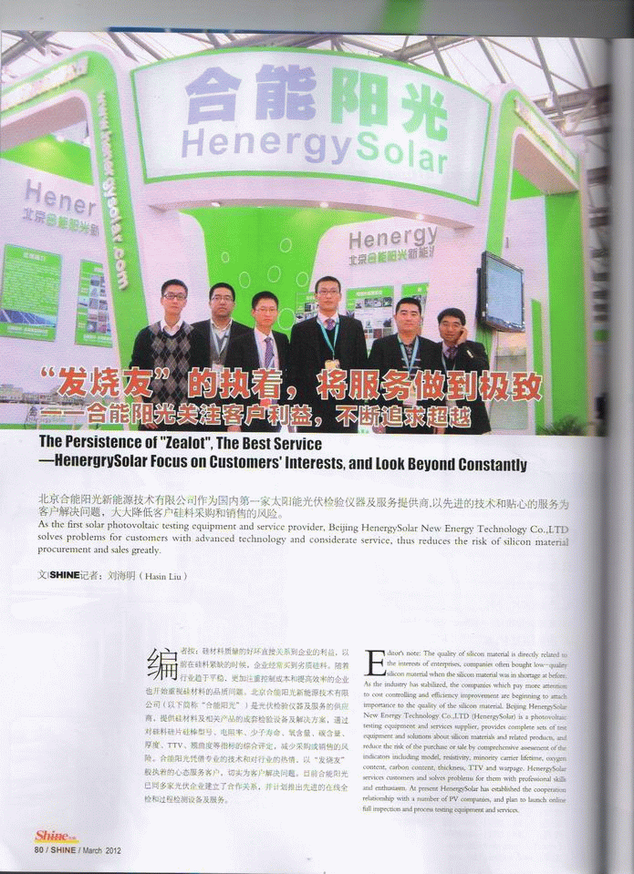 編者按:硅材料質(zhì)量的好壞直接關(guān)系到企業(yè)的利益,以前在硅料緊缺的時(shí)候,企業(yè)經(jīng)常買到劣質(zhì)硅料。隨著行業(yè)趨于平穩(wěn),更加注重控制成本和提高效率的企業(yè)也開始重視硅材料的品質(zhì)問題。北京合能陽光新能源技術(shù)有限公司(以下簡稱“合能陽光”)是光伏檢驗(yàn)儀器及服務(wù)的供應(yīng)商,提供硅材料及相關(guān)產(chǎn)品的成套檢驗(yàn)設(shè)備及解決方案,通過對硅料硅片硅棒型號(hào)、電阻率、少子壽命、氧含量、碳含量、厚度、TTV、翹曲度等指標(biāo)的綜合評定,減少采購或銷售的風(fēng)險(xiǎn)。合能陽光憑借專業(yè)的技術(shù)和對行業(yè)的熱情,以“發(fā)燒友”般執(zhí)著的心態(tài)服務(wù)客戶,切實(shí)為客戶解決問題。目前合能陽光已同多家光伏企業(yè)建立了合作關(guān)系,并計(jì)劃推出先進(jìn)的在線全檢和過程檢測設(shè)備及服務(wù)。