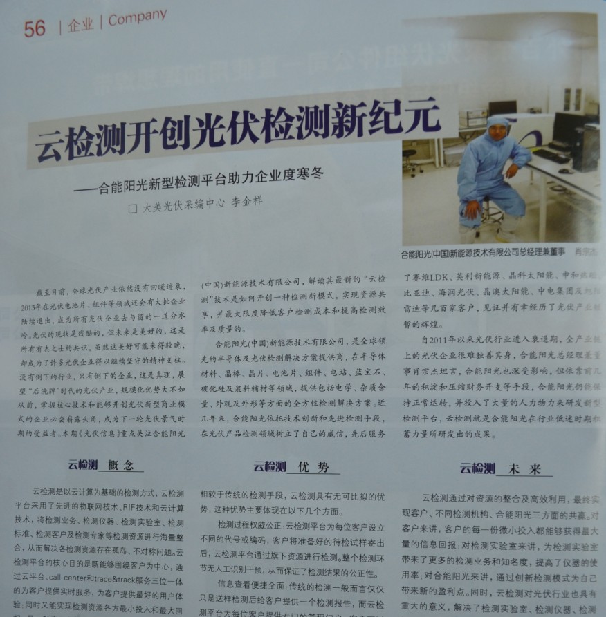 截至目前,全球光伏產(chǎn)業(yè)依然沒有回暖跡象,2013年在光伏電池片、組件等領(lǐng)域還會(huì)有大批企業(yè)陸續(xù)退出,成為所有光伏企業(yè)去與留的一道分水嶺。光伏的現(xiàn)狀是殘酷的,但未來是美好的,這是所有有志之士的共識(shí),雖然這美好可能來得較晚,卻成為了許多光伏企業(yè)得以繼續(xù)堅(jiān)守的精神支柱。沒有倒下的行業(yè),只有倒下的企業(yè),這是一個(gè)真理,展望“后洗牌”時(shí)代的光伏產(chǎn)業(yè),規(guī)模化優(yōu)勢(shì)大不如從前,掌握核心技術(shù)和能夠開創(chuàng)光伏新型商業(yè)模式的企業(yè)必會(huì)嶄露頭角,成為下一輪光伏景氣時(shí)期的受益者。本期《光伏信息》重點(diǎn)關(guān)注合能陽光(中國(guó))新能源技術(shù)有限公司,解讀其最新的“云檢測(cè)”技術(shù)是如何開創(chuàng)一種檢測(cè)新模式,實(shí)現(xiàn)資源共享,并最大限度降低客戶檢測(cè)成本和提高檢測(cè)效率及質(zhì)量的。