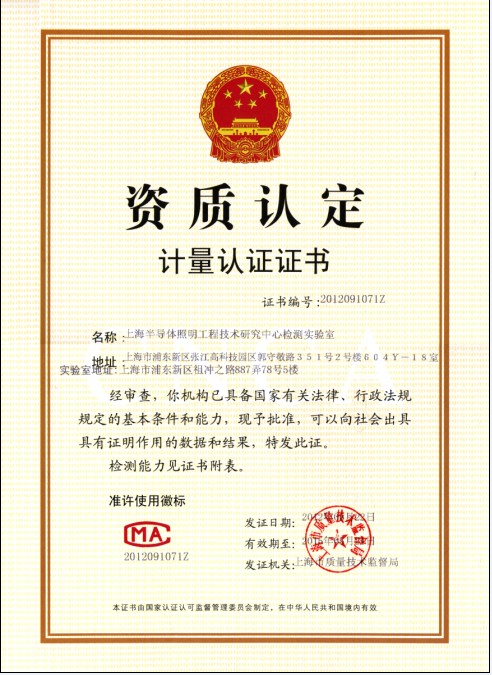 上海半導體照明工程技術研究中心檢測實驗室於2012年5月22日獲得中國計量認證CMA資質;於2012年6月20日正式獲中國合格評定國家認可委員會(CNAS)檢測實驗室能力認證(注冊編號:L5713)。